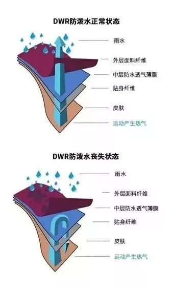 DWR是一種涂抹在面料表面的聚合物,它能提高面料表面張力,使其具有疏水性能或防水性能。DWR可滲入纖維,防止面料表層被水滲透。