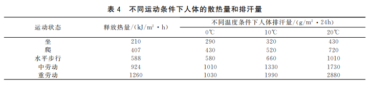 另外關于透濕性的檢驗。人體在不同運動情況下的散熱量和排汗量如下圖所示,因為人體在劇烈運動下的出汗量約2200-2500g/(m2?24h),所以沖鋒衣面料的透濕度應大于2200.