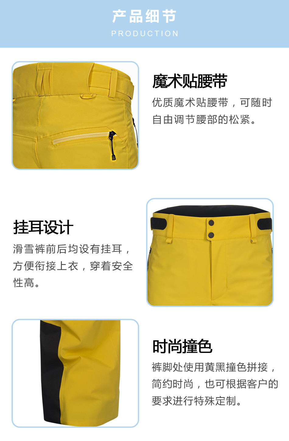 掛耳設計:滑雪褲定制前后均設有掛耳,方便銜接上衣,穿著安全性高。