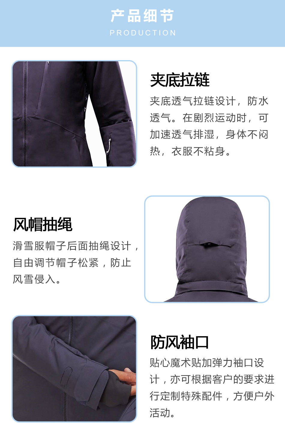 風帽抽繩:防水滑雪服定制出的帽子后面抽繩設計,自由調節(jié)帽子松緊,防止風雪侵入。